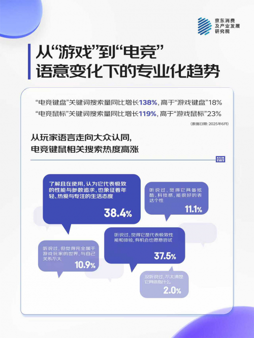 这一语言上的迁移,同样体现在消费者的实际行为中。从京东25年6月的数据表现上,“电竞键盘”与“电竞鼠标”的搜索量同比增幅(138% / 119%),远超传统的“游戏”关键词增速(18% / 23%)。越来越多的消费者主动在搜索框中输入“电竞”,不只是为了找到一款能用的设备,而是为了找到一套能让自己“像玩家一样使用”的装备。这场从语义到行为的变化,正在重塑整个外设市场的叙事方式。
