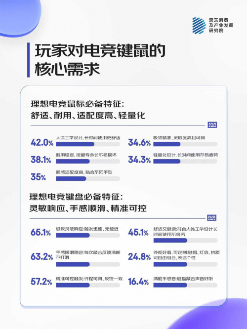 近日,京东消费及产业发展研究院联合京东采销与罗技G、雷蛇、ROG等品牌,对话2000名消费者,从使用习惯、消费趋势等多维观察键盘鼠标行业的新变化和趋势,对话结果显示: