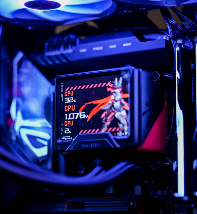 这套配置搭配的 ROG 龙王4 360 水冷,搭载6.67寸2K分辨率曲面屏,60Hz刷新率以及394PPI,画面显示效果比以往的水冷屏幕都要细腻流畅,标配定制32mm加厚冷排,3颗ROG定制高性能ARGB风扇,横扫目前市面上一切旗舰CPU。冷头可滑动设计让主板、内存的选择更自由,隐藏式水冷管设计让水管不再封印整机的颜值。