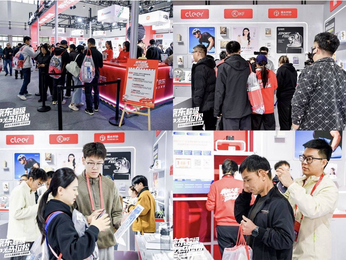 在北京马博会京东展区,智能手表和运动耳机两个专区成为现场亮点。手表展区汇聚华为、小米等品牌的多款产品,从入门级到专业级应有尽有。基础款轻盈时尚,适合日常佩戴与运动记录;高阶款则搭载多项专业运动监测功能,全面满足跑者在训练和赛事中的多样化需求。