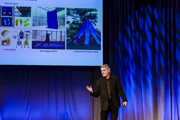 约瑟夫·帕拉迪索讲述,智能纤维超脱普通丝线,是将微缩至0.9毫米的集成电路嵌入可编织的柔性电路中,可具备光、声或微刺激等反馈机制,还能用于算法验证和信号交互。