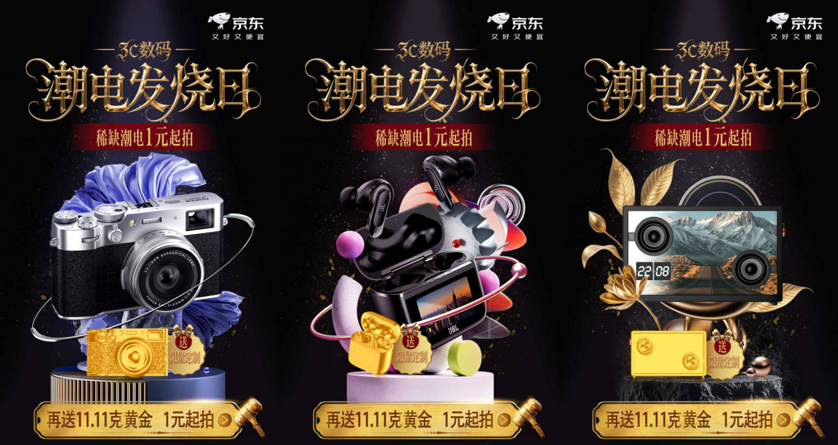 当晚20:30开启的第二轮拍卖同样看点十足,复古经典的富士X100VI银色相机、音质出众的JBL TOUR PRO 3蓝牙耳机、设计感出众的MORRORART艺术音箱将接力登场。本轮拍卖的所有潮电拍品同样附赠11.11克定制黄金,让每一次出价都兼具实用与收藏价值,为消费者带来双重惊喜。