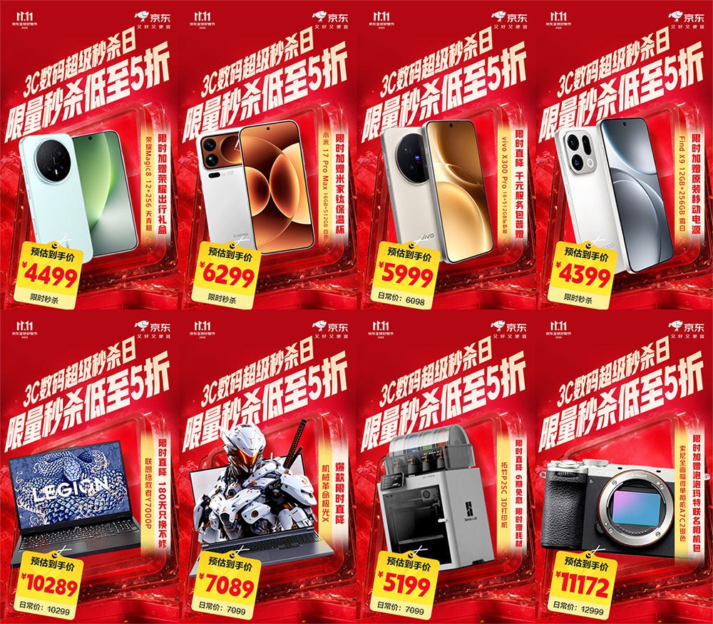 游戏本品类中,机械革命极光X爆款限时直降,预估到手价7089元;联想拯救者Y7000P限时直降并可享180天只换不修服务,预估到手价10289元。手机品类迎来多款旗舰机型:荣耀Magic8(12GB+256GB 天青釉)限时加赠荣耀出行礼盒,预估到手价4499元;OPPO Find X9(12GB+256GB 霜白)加赠原装移动电源,预估到手价4399元;Vivo X300 Pro(16GB+512GB 旷野棕)限时直降并普赠千元服务包,预估到手价5999元;小米17Pro Max(16GB+512GB 白色)则限时加赠米家钛保温杯,预估到手价6299元。影像与创意设备方面,索尼全画幅微单相机A7C2银色版限时加赠泡泡玛特联名相机包,预估到手价11172元;拓竹P2SC 3D打印机不仅限时直降,更支持6期免息并赠耗材,预估到手价5199元。