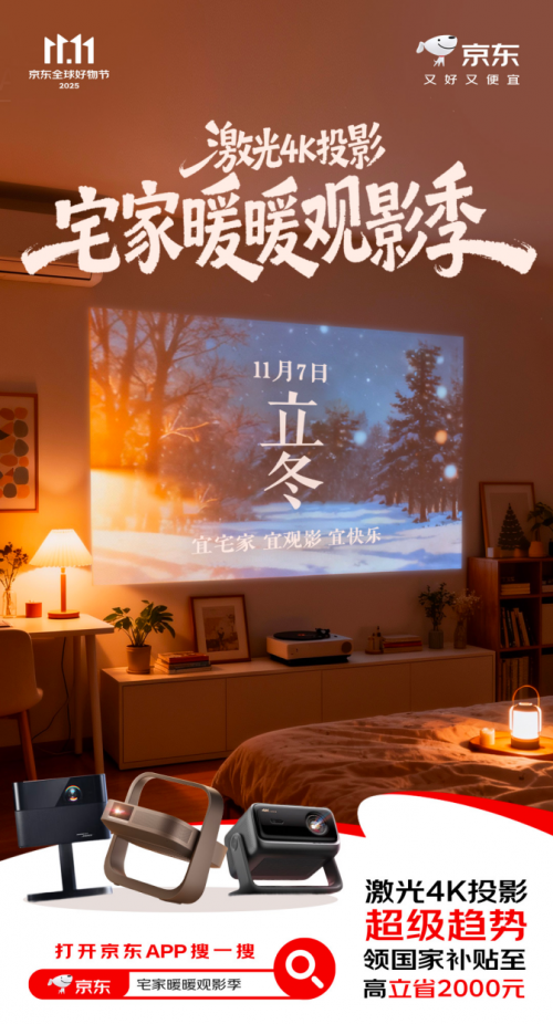 曾经,震撼的视听盛宴只属于电影院。如今,只需一台激光4K投影仪、一方幕布,就能把影院级体验轻松搬进客厅。京东11.11“宅家暖暖观影季”诚意登场,携手多款激光4K投影仪,用一方清晰明亮的巨幕,点亮你的宅家时光。即日起,打开京东APP搜索“宅家暖暖观影季”选购激光4K投影仪,领取国家补贴至高可省2000元,用更暖心的价格,开启更暖的陪伴。