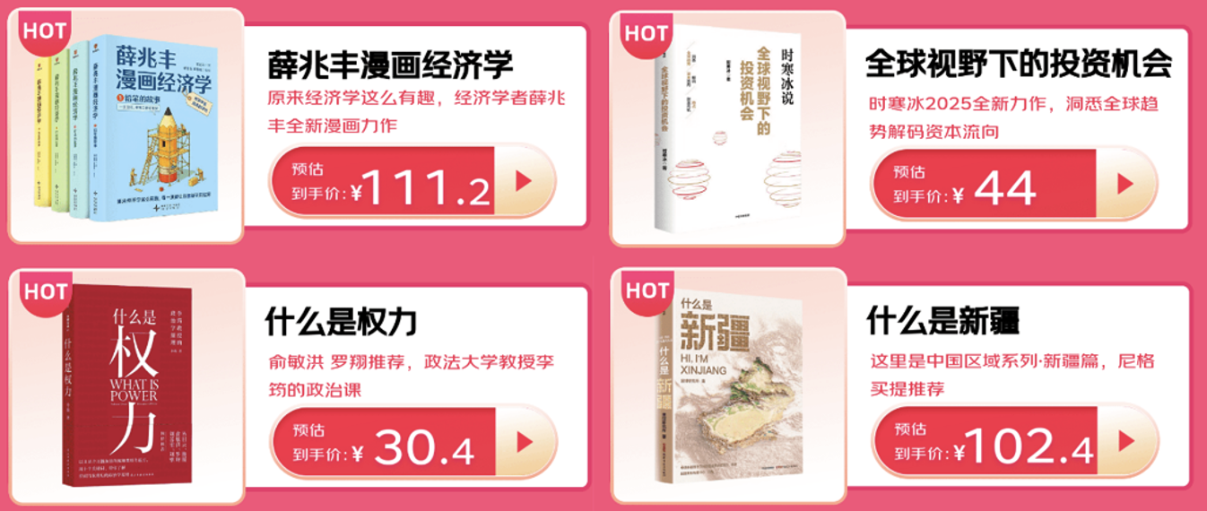 阅读的需求各有不同,好书的价值却始终一致。当对世界的好奇驱动我们探索本质,那些沉淀着专业知识的书籍便成了最佳向导。薛兆丰全新漫画力作《薛兆丰漫画经济学》预估到手价111.2元,通过生动形象的漫画画面让原本深奥晦涩的经济原理通俗易懂;时寒冰2025年全新力作《全球视野下的投资机会》,仅需44元就能为你深度解析全球趋势与资本流向;尼格买提倾力推荐的《什么是新疆》,用102.4元带你在文字中领略西域独特的风土人情与文化底蕴;俞敏洪、罗翔联合力荐的《什么是权力》预估到手价30.4元,聆听政法大学教授李筠的专业政治课,拨开认知迷雾,读懂权力的本质与运行逻辑。