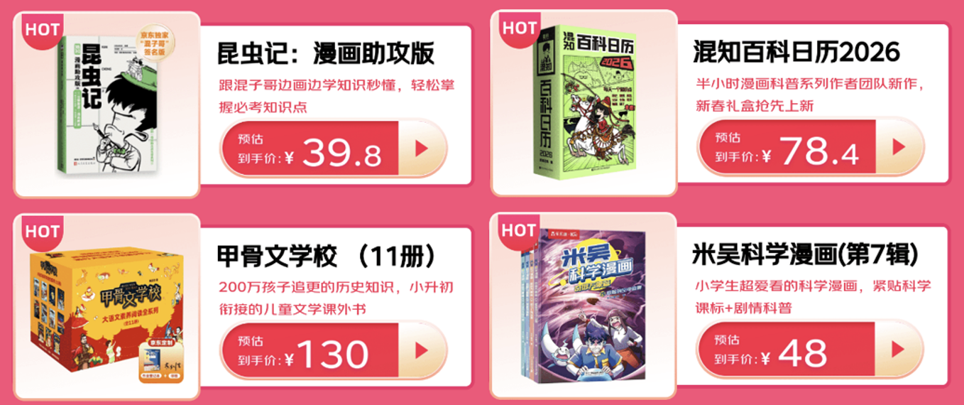 而孩子们的阅读世界,更需要用趣味与知识搭建起通往探索的桥梁。混子哥打造的《昆虫记:漫画助攻版》,39.8元就能让孩子在好玩又直观的画面中迷上奇妙的生物知识,轻松掌握必考知识点;半小时漫画科普系列作者团队的新作《混知百科日历2026》预估到手价78.4元,搭配新春礼盒,每天解锁一个新奇百科知识点;200万孩子追更的《甲骨文学校(11册)》全套130元,用生动有趣的历史故事串联起过往岁月,是小升初衔接的优质儿童文学课外书;《米吴科学漫画(第7辑)》则精准贴合小学生需求,将课标考点与趣味科普完美融合,让孩子在精彩的剧情中轻松掌握科学知识,48元即可入手。