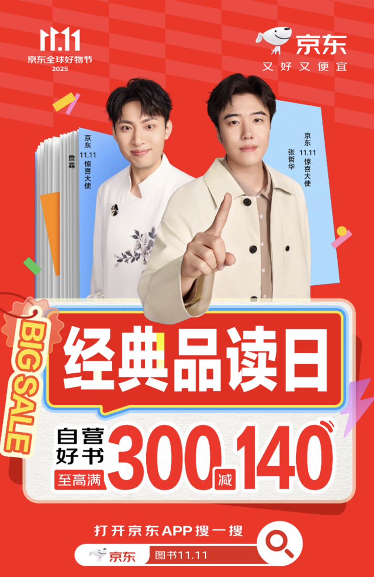 京东11.11正在进行,经典品读日惊喜来袭,带来京东自营好书至高满300减140的诚意福利,还有两位京东11.11惊喜大使詹鑫和张哲华倾情助力,让每一位爱书人都能以超值价格邂逅经典。本次活动覆盖多元品类的书籍,从沉淀千年的历史文化典籍,到直抵心灵的文学创作,再到拓展视野的知识读物,各类佳作一应俱全。打开京东APP搜索“图书11.11”参与活动,以满减优惠入手心仪好书,轻松开启阅读经典与滋养精神的双重体验。
