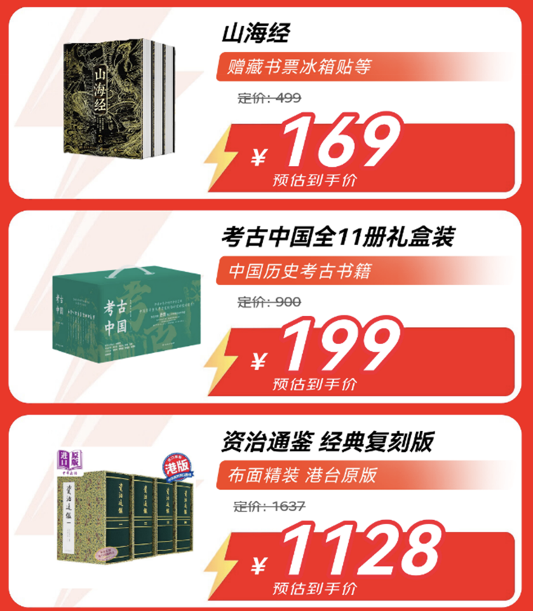 追溯文明根源,历史书籍为读者铺就一条触摸华夏文脉的通路。《山海经》以瑰丽奇幻的神话故事勾勒出上古文明的神秘轮廓,随书附赠的藏书票与冰箱贴,让阅读之外更添收藏趣味,预估到手价169元。《考古中国全11册礼盒装》则以全景式视角呈现中国历史考古成果,199元让厚重典籍变得触手可及,带领读者见证文明的演进。布面精装的《资治通鉴 经典复刻版》,港台原版,价格1128元,字里行间皆是历史的沉淀与智慧的光芒,让读者在翻阅中感受华夏文明的温度与深度。