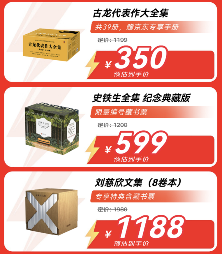 卸下历史的行囊,文学的斑斓画卷又缓缓展开,为不同读者打造阅读盛宴。《古龙代表作大全集》39册完整收录武侠经典,附赠的京东专享手册更添收藏价值,350元带读者轻松解锁江湖快意恩仇,在刀光剑影中感受侠骨柔情。《史铁生全集 纪念典藏版》附带限量编号藏书票,预估到手价599元,每一次品读都令人动容。《刘慈欣文集(8卷本)》囊括科幻大师的巅峰之作,专享特典中的精美藏书票堪称点睛之笔,价格降至1188元,带领读者开启星际漫游,探索浩瀚宇宙的未知边界。
