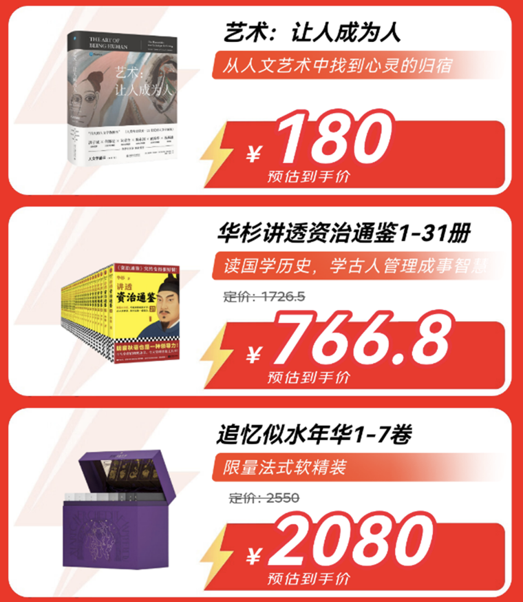 文学的余韵尚在回味,启迪思想的佳作又为读者打开全新视野维度。《艺术:让人成为人》从人文艺术的角度探寻心灵归宿,预估到手价180元,让读者在轻松阅读中完成美学启蒙,提升对生活的感知力。《华杉讲透资治通鉴1-31册》深度拆解国学历史中的管理智慧,1726.5元定价优惠后仅需766.8元,帮助读者将古人的成事经验融入当下生活与工作。还有2080元的《追忆似水年华1-7卷》以限量法式软精装呈现世界经典,细腻的文字如时光流水,让读者在阅读中感受岁月流转的诗意与美好。