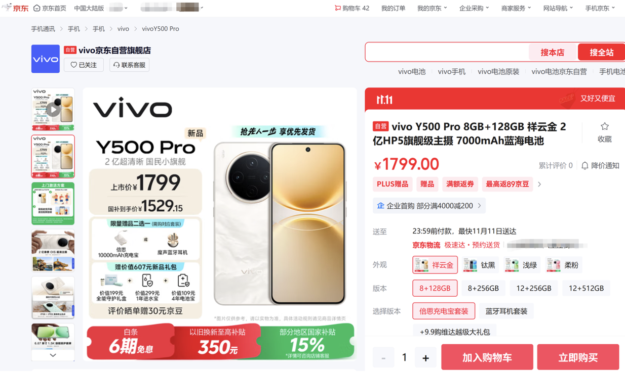 11月10日,vivo Y500 Pro正式发布,售价1799元起,将于11月14日开售。为带给消费者更多权益,京东携手vivo打造先人一步加速换新计划,提供限量现货抢先发货,最快发布会第二天送达。京东11.11火热进行中,先人一步下单还可享权益随心选,包括倍思10000mAh充电宝、魔声蓝牙耳机,两项权益可任选其一。目前,京东已同步开启vivo Y500 Pro预售,部分地区享国补到手价1529.15元起,参与预售还可享价值607元新品礼包(全能守护礼盒+1年进水宝+4年电池宝)、6期免息、以旧换新至高补贴350元、评论晒单赢30元京豆等福利,加9.9元限量抢维达越级生活大礼包。