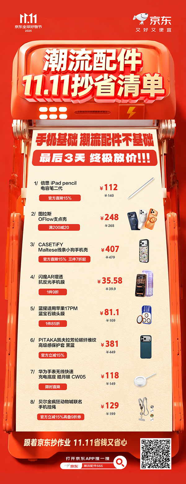 在京东 11.11又好又便宜的福利加持下,不少朋友换新了手机,入手手机支架、手机壳、手机链等配件绝对是必做功课。图拉斯OFlow支点壳是潮流人士的必备之选,京东下单可享满200减20优惠,到手价只需248元;CASETIFY Maltese线条小狗手机壳以其独特的设计和精致的工艺,成为潮流新宠,京东11.11官方直降15%、三件7折起,最终到手价479元;贝尔金疯狂动物城联名手机挂绳,京东下单享官方直降15%、再叠9折券福利,到手价129元;倍思iPad pencil电容笔二代,京东官方直降15%,只需112元就能到手。另外闪魔AR增透抗反光手机膜享1件9折福利,到手低至35.58元;蓝猩蓝宝石镜头膜,适用于iPhone 17系列,京东下单立减15%到手只需81.1元;华为手表无线快速充电底座,京东限时直降只需118元。