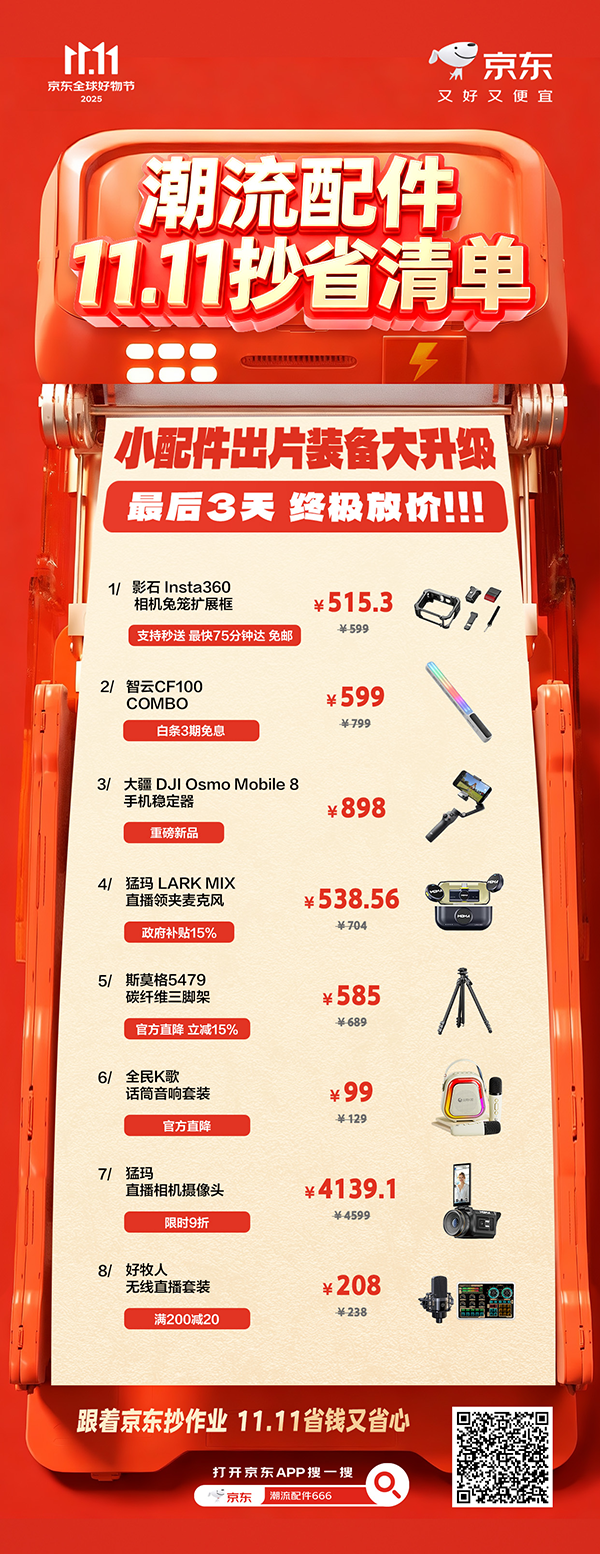 对于户外创作者而言,实用、便携的配件能更好地出片。影石Insta360相机兔笼拓展坞,让相机秒变街拍神器,京东到手价515.3元,还支持秒送、最快75分钟送达;智云CF100 COMBO,户外专用补光神器,氛围感直接拉满,京东到手价599元,还可享3期免息;重磅新品大疆DJI Osmo Mobile 8手机稳定器,原生跟拍、收音、补光一体让拍摄更简单,京东到手价898元;猛犸LARK MIX直播领夹麦克风,纽扣设计满足每一个收音需求,京东下单可享政府补贴15%福利,到手价只需538.56元;斯莫格5479碳纤维三脚架,官方立减15%,京东到手价585元;全民K歌话筒音响套装低至99元;猛犸直播相机摄像头限时享9折福利,到手只需4139.1元;好牧人无线直播套装可享满200减20福利,京东下单到手只需208元。