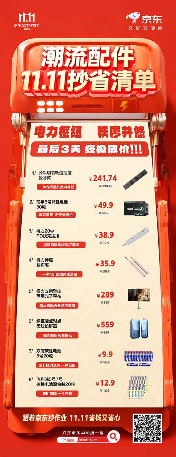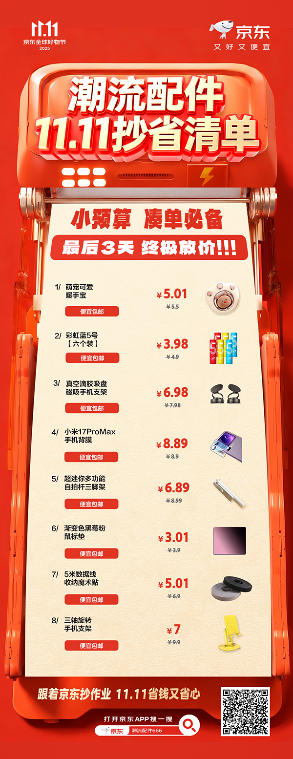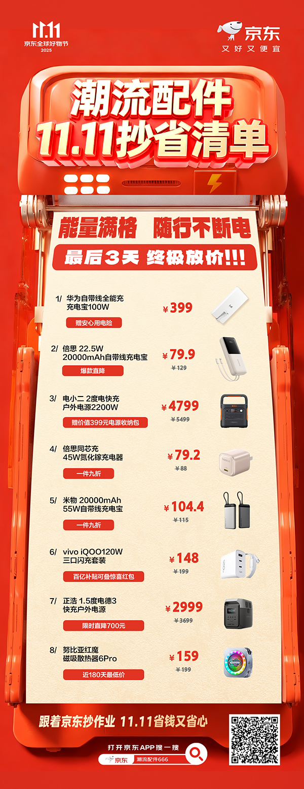京东配件11.11超省清单火热来袭!据了解这是京东11.11最后一波放价,倒计时3天别等候,锁定低价全带走!不管是出片装备必备的小配件、电量焦虑必备的充电宝,还是还原桌面整洁的轨道插座,或者是科学办公必备好物,在京东11.11都能找到你想要的。而且来京东下单潮流配件,还可享官方直降15%、叠券低至5折等福利,只需打开京东搜索「潮流配件666」即可直达,总有一款让你中意!