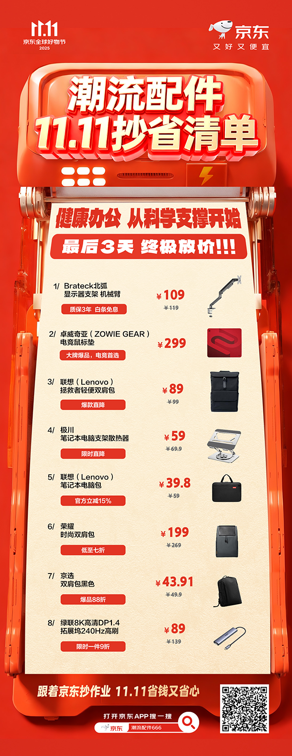 随着久坐带来的颈椎疼痛,越来越多的职场人开始使用科学支撑来缓解。Brateck北弧显示器支架机械臂,京东下单可享3年质保,只需109元就能助力颈椎减负;极川笔记本电脑支架散热器京东限时直降,只需59元就能让笔记本“清凉”办公;绿联8K高清DP1.4拓展坞240Hz 高刷,京东下单享限时9 折福利,89元就能得到拓展设备接口。此外,低至299元的卓威奇亚(ZOWIE GEAR)电竞鼠标垫、89元的联想拯救者轻便双肩包、39.8元的联想笔记本电脑包、199元的荣耀时尚双肩包、43.91元的京选双肩包也是不错的选择,从硬件支撑到装备收纳,全方位升级职场人办公体验。