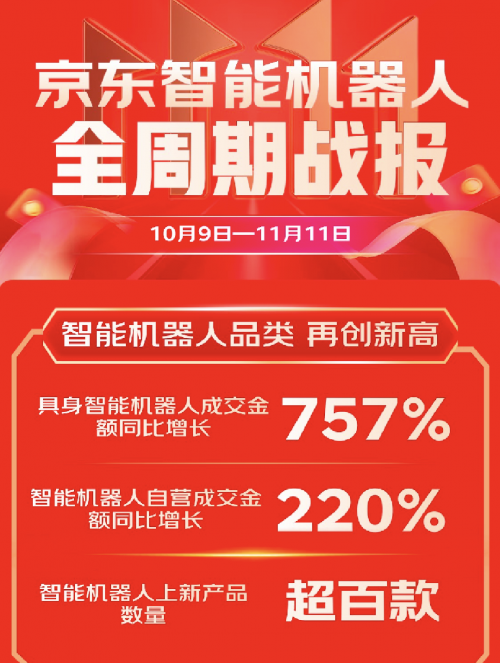京东11.11圆满收官,智能机器人品类实现爆发式增长!京东智能机器人全周期战报显示,10月9日至11月11日,京东智能机器人成交额再创新高,其中具身智能机器人成交金额同比增长757%,智能机器人自营成交额同比提升220%,上新数量突破百款,成为3C数码领域增长最为迅猛的品类之一。这一成绩不仅印证了消费市场对智能科技产品的高度认可,也凸显了京东在智能机器人全链路生态建设中的引领作用。