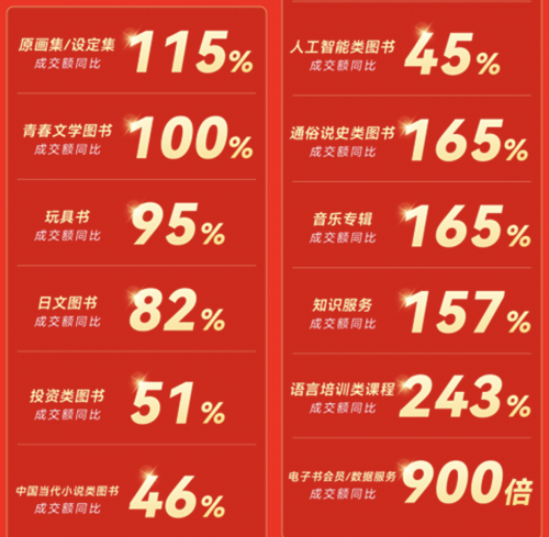 多品类成交额同比大幅增长,原画集/设定集成交额同比增长115%;青春文学图书成交额增长达100%;通俗说史类图书、音乐专辑成交额均同比增长165%;知识服务增长157%,语言培训类课程增长至243%,电子书会员/数据服务同比增长高达900倍。人工智能、投资、中国当代小说类图书也分别实现45%、51%、46%的增长。