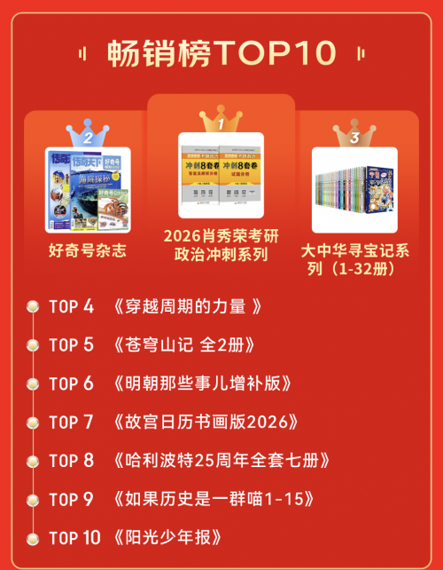 畅销与新书榜单引领阅读趋势,畅销榜前十榜单现已出炉——《2026肖秀荣考研政治冲刺系列》夺得榜首,《好奇号杂志》位居第二,《大中华寻宝记系列(1-32册)》取得第三名,《穿越周期的力量》《苍穹山记》《明朝那些事儿增补版》等畅销图书也跻身榜单。
