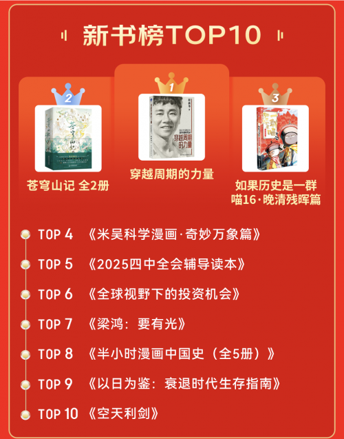 新书榜TOP10榜单也带来惊喜,《穿越周期的力量》位居第一,《苍穹山记 全2册》、《如果历史是一群喵16 晚清残篇》也跻身前三,热销的《米吴科学漫画・奇妙万象篇》位居第四,《2025 四中全会辅导读本》等新书也进入榜单。