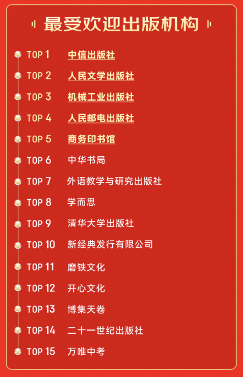 出版机构与POP店铺的表现亮眼,最受欢迎出版机构TOP15中,中信出版社排名第一,人民文学出版社、机械工业出版社等实力上榜。
