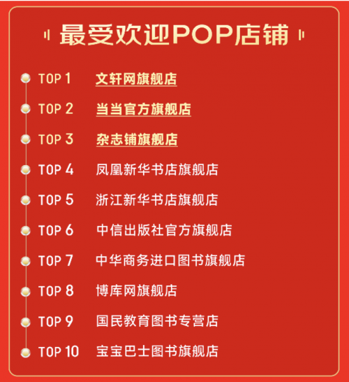 最受欢迎POP店铺前十名也已公布,第一名的文轩网旗舰店、第二名的当当官方旗舰店与第三名的杂志铺旗舰店领跑榜单,凤凰新华书店旗舰店、浙江新华书店旗舰店、中信出版社官方旗舰店也实力强劲。
