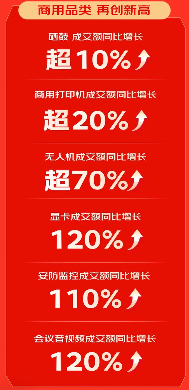 本次京东11.11期间,政企商用品类各细分领域均实现显著增长,呈现出全面发展的良好态势。其中专业计算与智能协作设备表现尤为突出,显卡与会议音视频设备成交额均实现120%的大幅提升,安防监控设备成交额增长110%,无人机成交额增长超70%;与此同时,高效输出设备保持稳定增长,商用打印机成交额同比增长超20%,硒鼓类产品增长超10%。各品类的同步提升,共同推动了3C商用设备品类的整体增长。