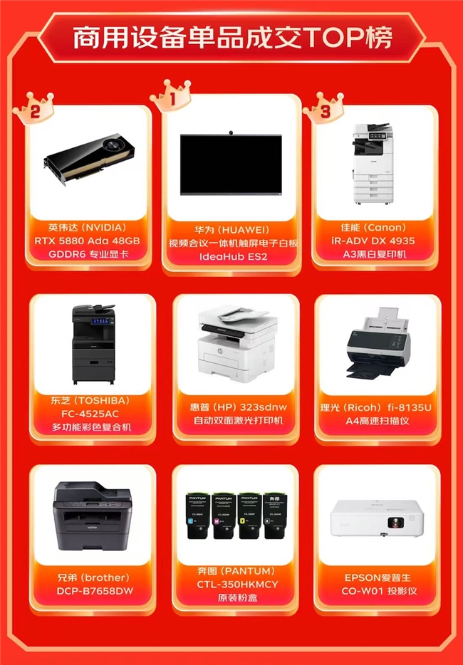 商用设备热销单品榜单显示,英伟达RTX 5880专业显卡、华为视频会议一体机、佳能iR-ADV DX 4935复印机位居前三;东芝FC-4525AC复合机、惠普323sdnw打印机、理光fi-8135U扫描仪等设备也凭借其专业性能跻身榜单,体现出政企客户对设备专业性、可靠性与场景适配性的高标准要求。