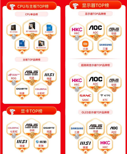 在产品阵营上,核心硬件市场品牌格局清晰,高性能配置成为主流选择。CPU单品销量榜单由R9-9800X3D、R7-9700X、I5-14600KF领跑;主板品牌竞争中华硕、ROG、微星位居前三。显卡市场华硕、七彩虹、技嘉位列品牌榜首。显示器品类中,AOC、HKC、华硕占据销量前三;在细分领域,超高刷新率显示器市场由AOC、HKC、华硕主导;OLED显示器则呈现华硕、三星、AOC三强格局。