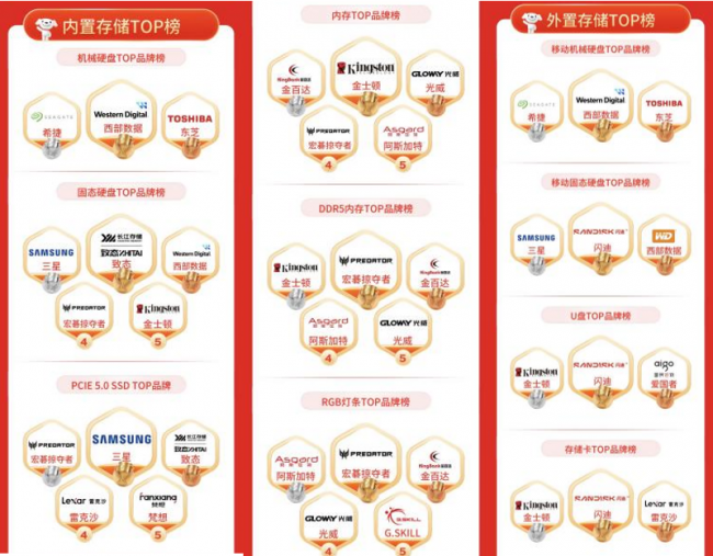 存储设备市场呈现多元化需求,高性能产品备受青睐。内置存储方面,机械硬盘品牌前三为西部数据、希捷、东芝;固态硬盘致态、三星、西部数据位列前三;PCIE 5.0 SSD三星、宏碁掠夺者、致态领跑市场;内存品牌金士顿、金百达、光威获得用户青睐;DDR5内存宏碁掠夺者、金士顿、金百达位列前三;RGB灯条宏碁掠夺者、阿斯加特、金百达备受喜爱。外置存储领域,移动机械硬盘西部数据、希捷、东芝占据前三;移动固态硬盘闪迪、三星、西部数据领跑市场;U盘品牌闪迪、金士顿、爱国者位列前三;存储卡闪迪、金士顿、雷克沙成为用户首选。