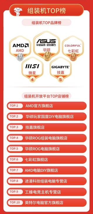 个性化组装电脑市场也迎来持续走热,品牌旗舰店表现突出。组装机品牌华硕、AMD、七彩虹占据销量前三。开放平台店铺AMD官方旗舰店、华硕玩家国度DIY电脑旗舰店、技嘉旗舰店位列销售前列。