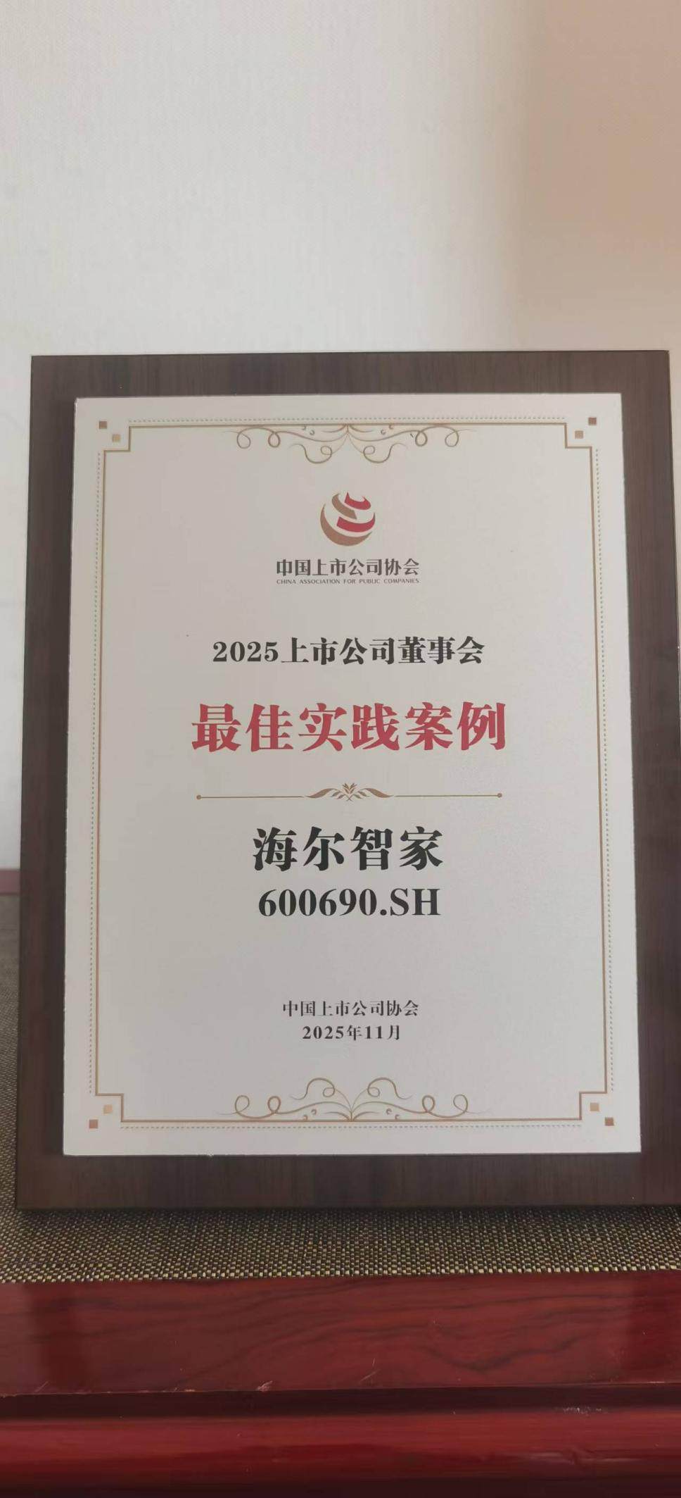 11月18日,中国上市公司协会第三届理事会第六会议在北京召开,会上正式发布了“2025上市公司董事会最佳实践创建活动”评选结果。其中,海尔智家荣获“2025上市公司董事会最佳实践奖”。