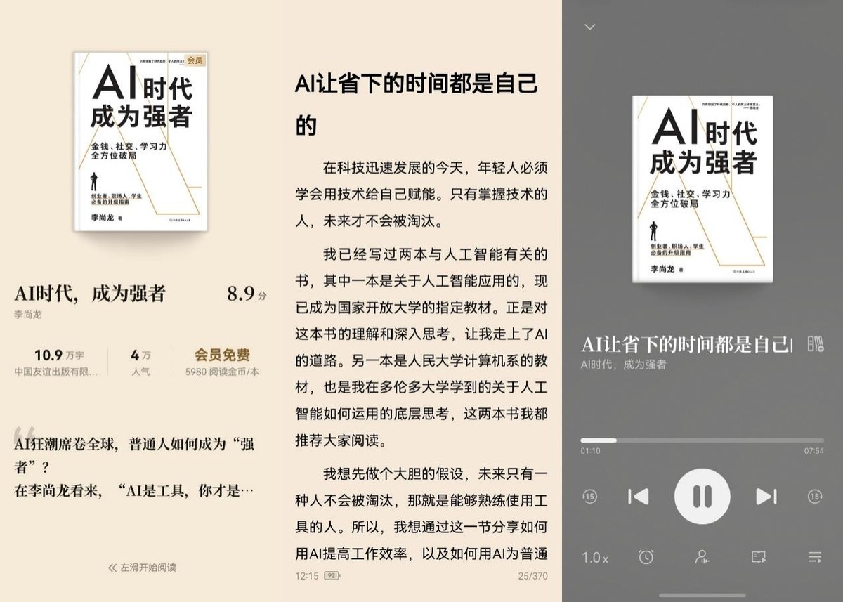 不得不说,华为阅读的书籍资源挺丰富的,而且会员可以畅读全站的出版书籍。我以“AI”作为搜索关键词,搜到最近很火的《AI时代,成为强者》。这本书不是干巴巴地讲AI技术,而是教我们如何用AI工具来变强,特别是作者李尚龙的观点“AI是工具,你才是主语”非常戳我。我立马把这本书加入书架,利用通勤坐车、睡前等碎片时间进行干货学习:如何用AI帮我优化工作流节省时间、打造个人IP的独特性、培养自己的“人机协同”思维......精品音色3.0、AI眼动翻页等功能让我日常的阅读体验变得更方便、沉浸,解锁读书的多种姿势!