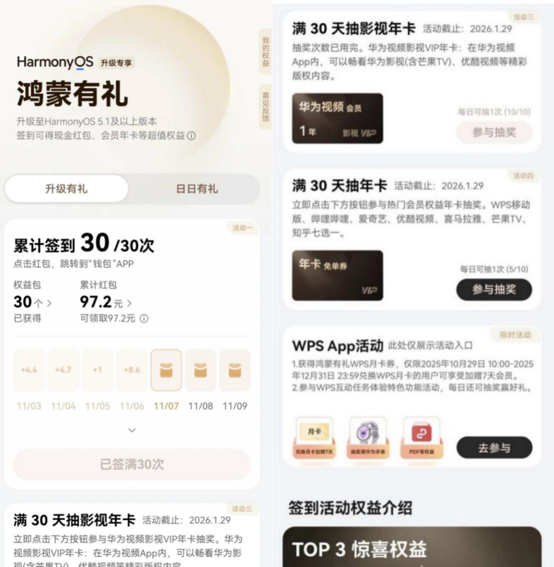 “鸿蒙有礼”这活动实在太宝藏了,签到可以领到随机超值权益,除了华为阅读会员,华为影视会员、华为音乐超钻会员和华为主题会员都有机会领到,满足我们影音娱乐、学习提升等需求。而且完成首次签到第30天,还能解锁抽影视年卡和热门应用年卡免单券的抽奖资格,有幸抽到的话直接拿下未来一年会员自由,那可省下不少钱呢!