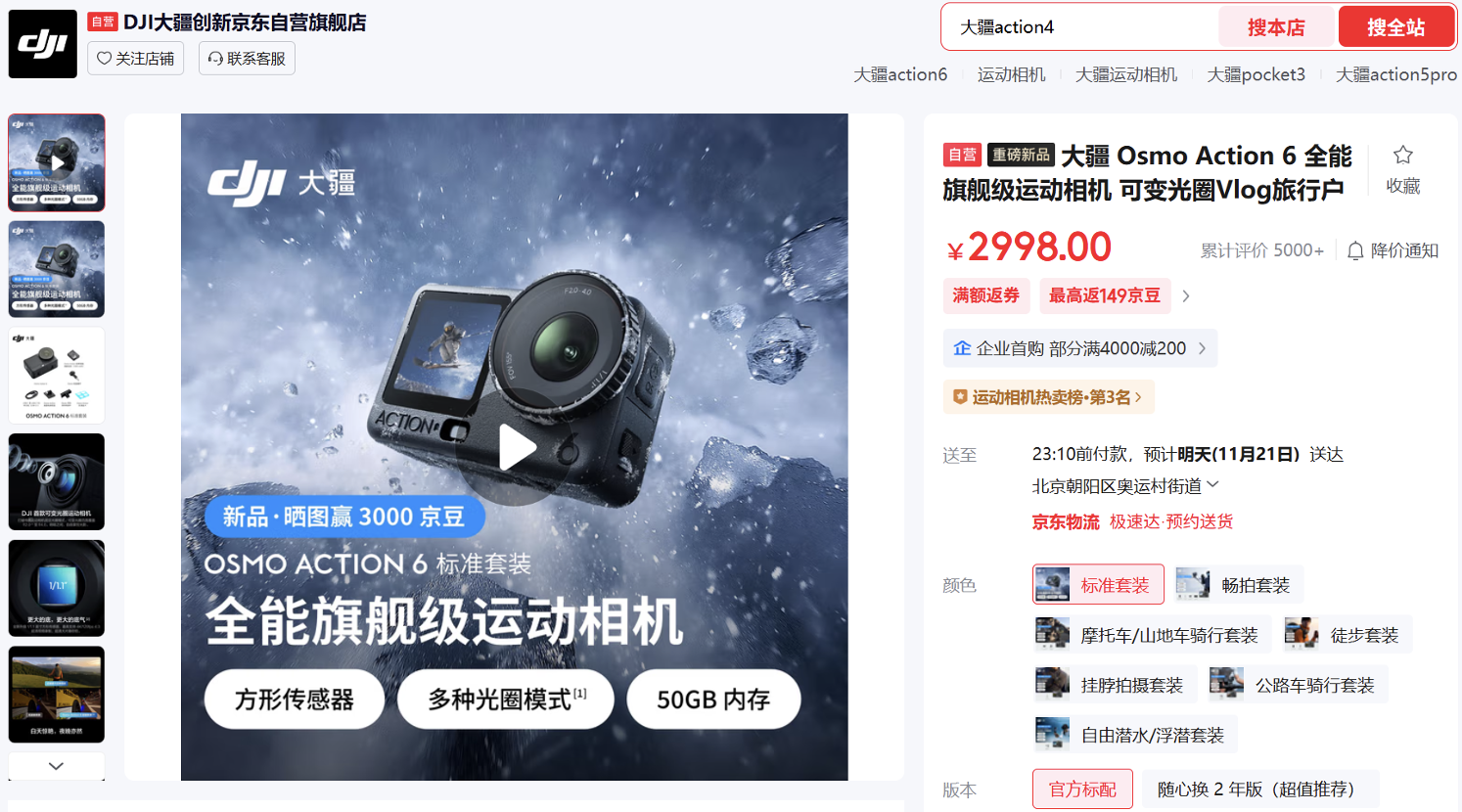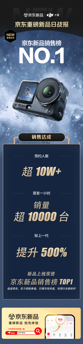 这款备受期待的新品在正式发售前便已引发广泛关注。数据显示,Osmo Action 6在京东的预约人数突破10万大关,用户的期待在开售后迅速转化为强劲的购买力,使其首发销量较上一代产品实现高达500%的显著增长,创下令人瞩目的市场表现。
