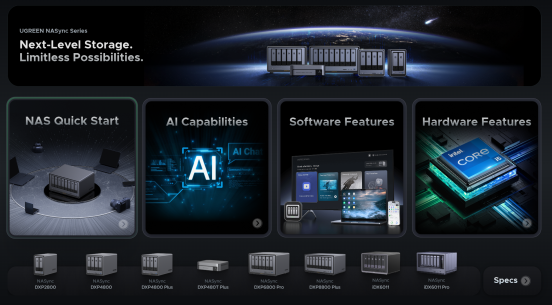 其中DXP4800 Pro作为刚推出的新品,聚焦更专业更进阶的极客需求,算力更强大,搭载i3-1315u处理器,主打家庭数据存储中心定位,支持AI相册自动分类与跨设备同步、家庭影院搭建;DXP6800 Pro凭借i5-1235u处理器与双万兆网口,可流畅运行3A游戏资源库与多设备共享运行,实现接近本地的流畅游戏体验;DXP480T Plus采用i5-1235u处理器与M.2全闪存储架构,双雷电4接口带来疾速传输体验,支持Docker、虚拟机等功能,满足进阶用户的功能拓展需求;DXP8800 Pro则以i7-1255u处理器与双雷电4接口,8 盘位高速存储方案,精准匹配专业用户的大容量、高性能存储需求。