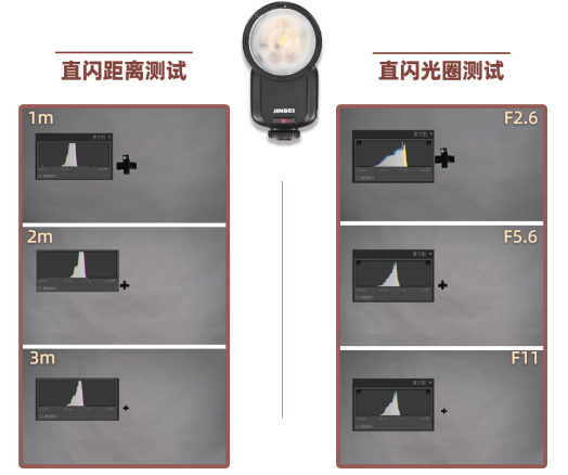 以金贝HD2PLUS根据不同距离和不同相机光圈测试结果为例,从直方图中的像素集中范围可以看出,在直闪情况下,无论是距离或着是光圈的改变,对最终TTL曝光的影响都不大。所以直闪是TTL能够测准的关键。