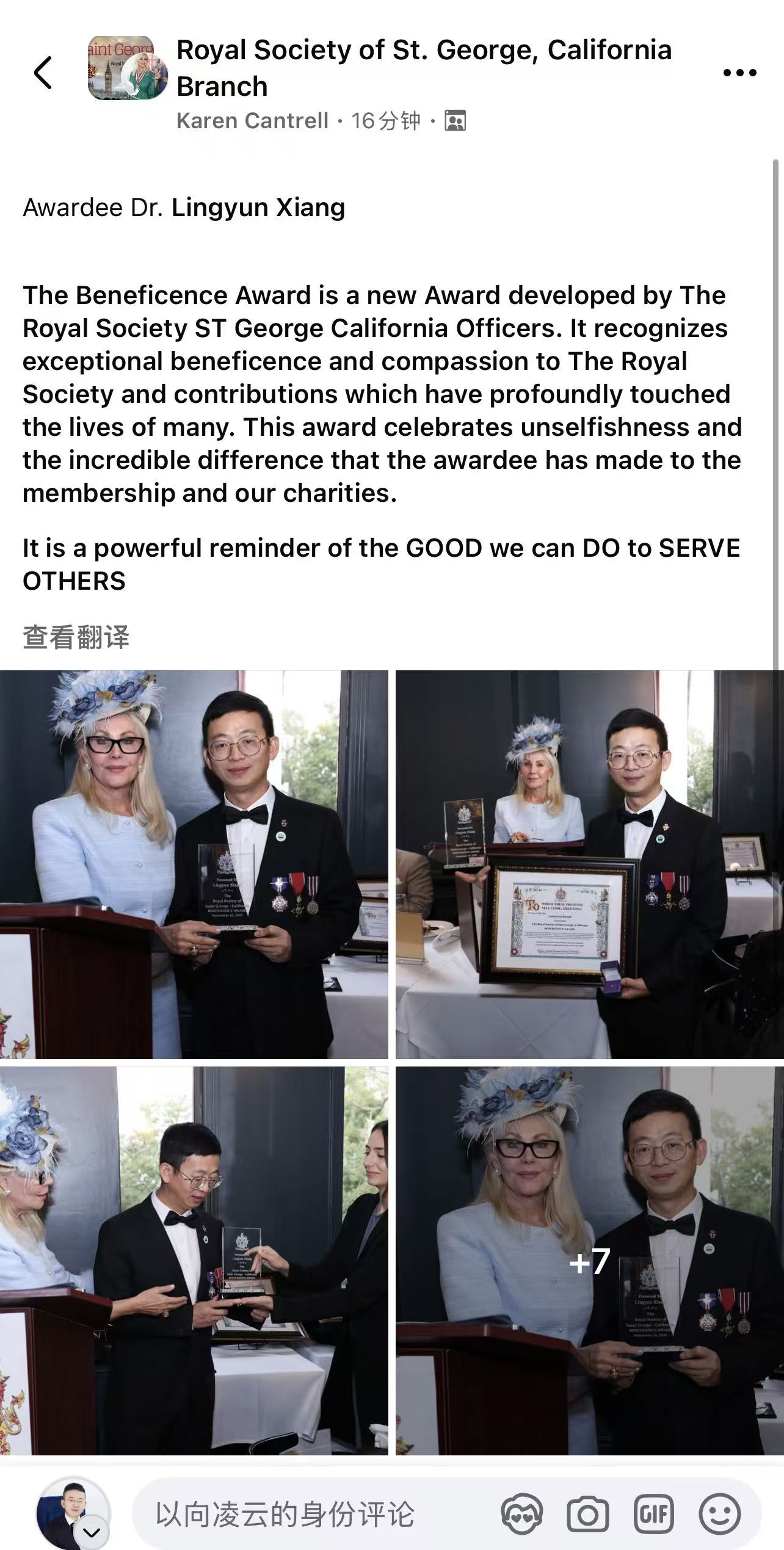 (2025年11月16日,美国加州洛杉矶比弗利山庄)在英国圣乔治皇家学会加州分会(The Royal Society of Sant. George, California)年度授勋仪式上,旅美经济学家、国际公益推动者向凌云博士(Dr. Lingyun Xiang)荣获该学会最新设立的“慈善嘉奖”——Beneficence Award。授勋仪式由学会主席、Ratu Muda Princess Karen Cantrell公主主持,并在其官方平台发布授勋公告与现场照片。
