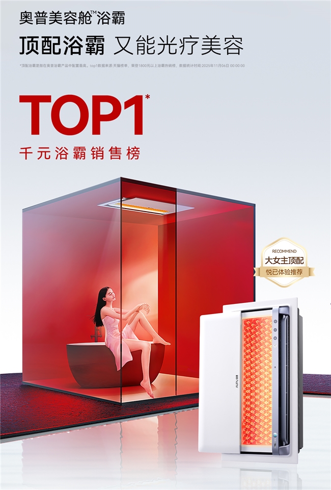 双11的成绩单,是奥普32年积淀的必然结果,更是品牌引爆浴室经济的新起点。面对中产家庭对卫浴生活的更高期待,奥普将继续深耕技术创新,拓展场景边界,以技术创新与优质服务为纽带,用热能环、美容舱、线性浴霸等高端产品线持续激活消费需求。从单一取暖工具到卫浴生活解决方案,奥普正以产品力重构浴室场景价值,让“品质卫浴”成为家庭消费新热点——这,正是奥普领跑行业、引爆浴室经济的核心密码。