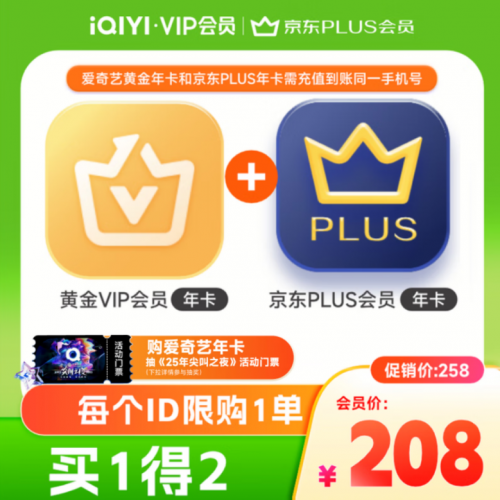 平时在手机、平板、电脑端追剧的消费者可以选择爱奇艺黄金VIP会员年卡+京东PLUS会员年卡,会员价208元,每个ID限购1单。