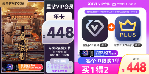 在七端通用的基础上,爱奇艺星钻VIP会员还可享加更礼免费看,并送体育会员,年卡到手价448元;爱奇艺星钻VIP会员年卡+京东PLUS会员年卡,到手价448元,每个ID限购1单。