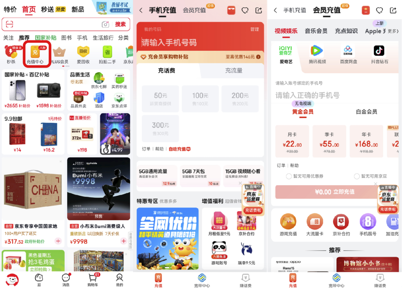 此外,到京东APP首页,点击“充值中心”,可一站式搞定话费、流量及视频、音乐等各类APP会员充值,满足各类充值需求。