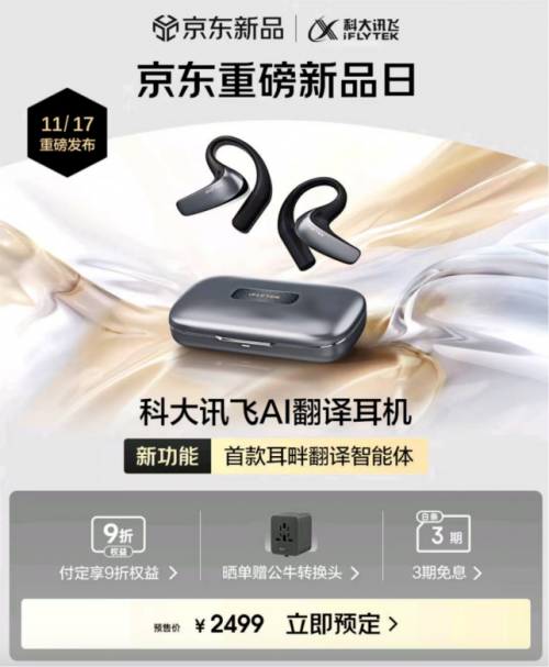科大讯飞推出了全球首款“骨导+气导”形态的开放式翻译耳机——科大讯飞AI翻译耳机,该产品基于AI同传技术和软硬件一体降噪技术打造,能为用户打造多个翻译场景的绝佳体验。目前该新品已在京东抢先开售,预售价2499元,现在付定金即可享9折优惠,此外还有白条3期免息、晒单赠公牛转化插头等多重福利,助力用户轻松解锁智能翻译新体验。