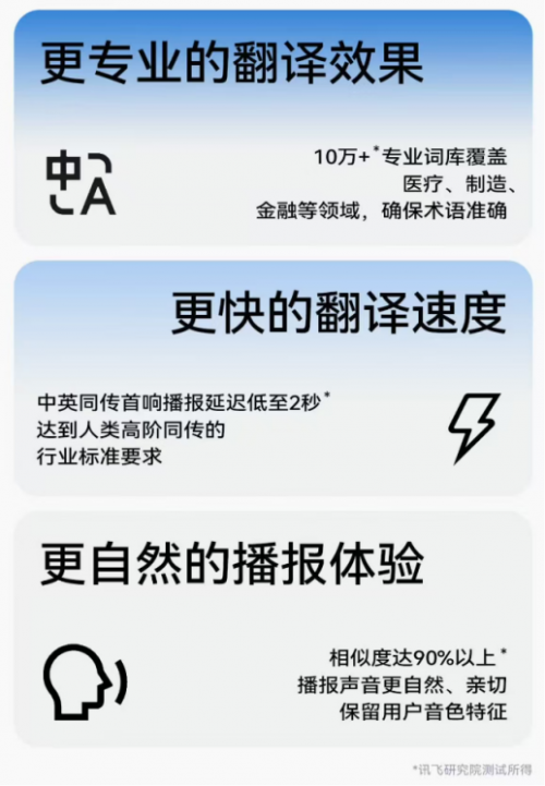 在核心翻译技术上,科大讯飞AI翻译耳机搭载了科大讯飞最新语音同传大模型,将翻译准确度、响应速度、播报自然度推向了新的高度,整体效果提升25%,跨语言交流更自然、流畅,更贴近真人体验。
