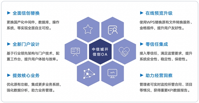 基于原有办公系统已经无法满足多方面要求,中信城开在国家的标准和建设规范的引导下,快速推进OA的信创适配和升级改造。