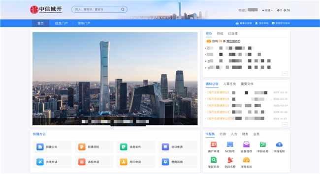 基于蓝凌EKP数智化办公平台,中信城开构建了“全栈信创、全程数智、全面集成”的智慧协同OA平台。