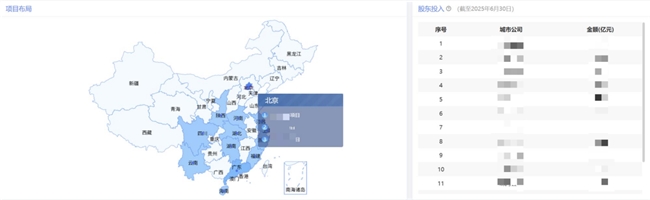 项目数据看板:通过地图的形式,展示全国各地项目,通过鼠标点击快速切换查看,使数据更加直观,方便统计和查看;项目投资台账,实时展示多维度投资拓展信息,支持一键跳转项目细项。