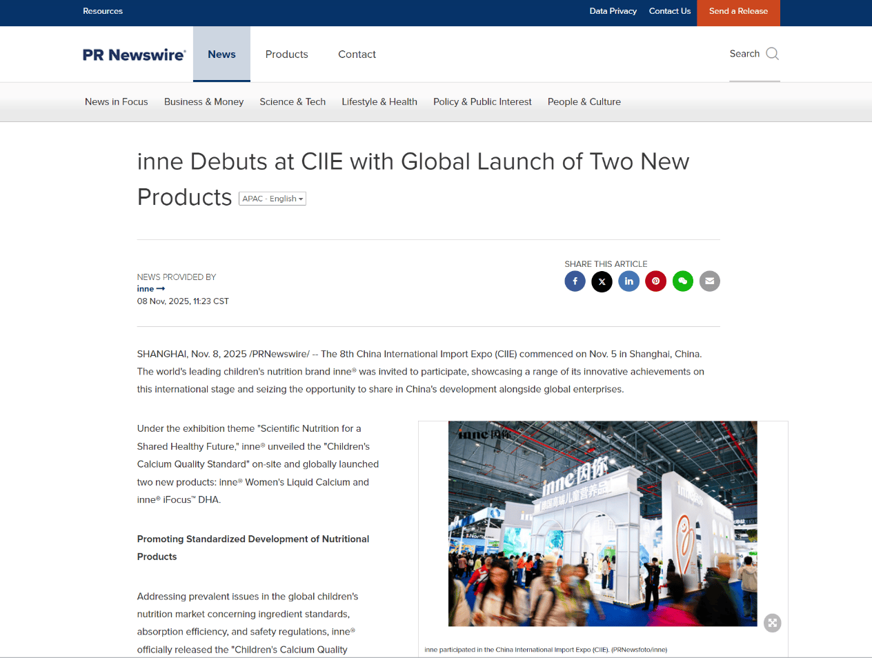 值得关注的是,inne在本届进博会的表现也获得国际媒体的持续关注。美通社(PR Newswire)、美联社(Associated Press)、西班牙主流通讯社(Europa Press)、越南国家通讯社(VietnamPlus)等多家海外主流媒体相继报道品牌参展动态,对其在产品创新、科研实践和中国市场的表现予以关注。多家媒体在报道中指出,inne因你携创新成果亮相进博会,与全球企业共同分享中国市场带来的发展机遇,显示出inne因你品牌在国际营养产业链中的影响力正持续提升。