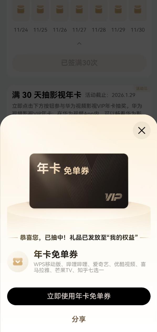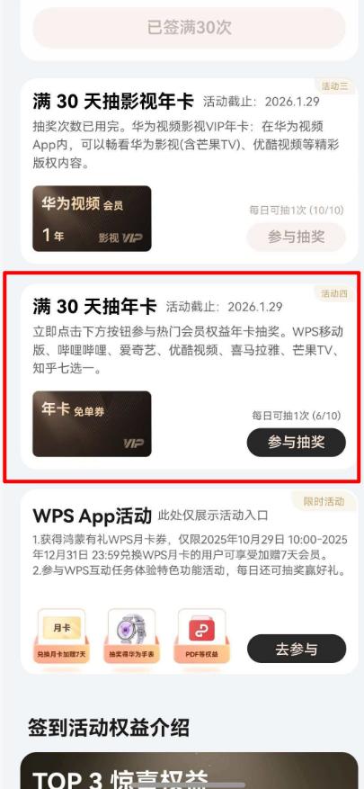 升级鸿蒙6后,我习惯性地桌面右滑进入负一屏,一眼就看到了“鸿蒙有礼”的活动入口。点进去发现活动福利很多样:只要每天签到,就可以领到现金红包、元服务优惠券、热门应用会员权益等福利,而且还能解锁“终极大奖”——首签日后第30天,就能参与“年卡免单券”的抽奖活动。