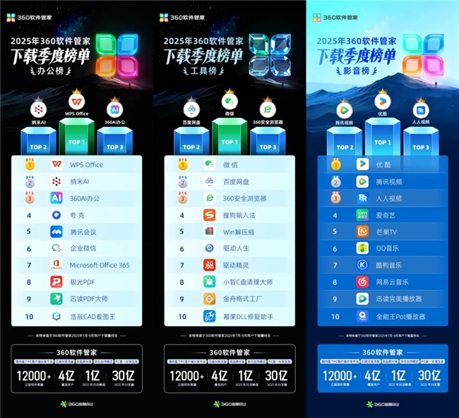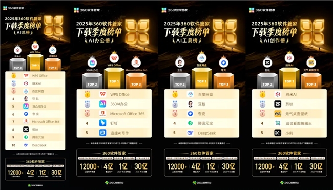 然而在PC端,360软件管家发布的PC应用季榜则展现了另一番景象。在“AI总榜”和“AI办公榜”中,除了WPS Office这样的国民级应用,迅捷AI写作等专注垂直场景的工具类应用表现同样强劲。“AI创作榜”中,剪映、小剪等视频创作工具,以及元气桌面壁纸等个性化工具也名列前茅。