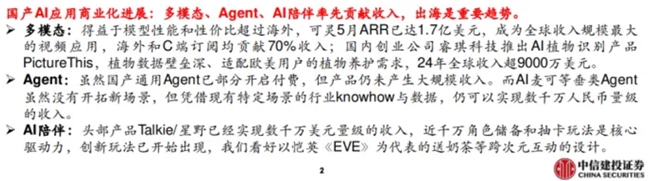 一份来自中信建投证券的研报分析,国产AI应用中,多模态、Agent和AI陪伴率先贡献收入。